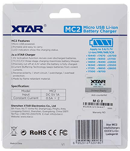 Specification: Xtar MC2 intelligente CCCV Li-Ion lader (5 volt, 1 A, 2 laadsleuven) voor formaten 14500 tot 26650