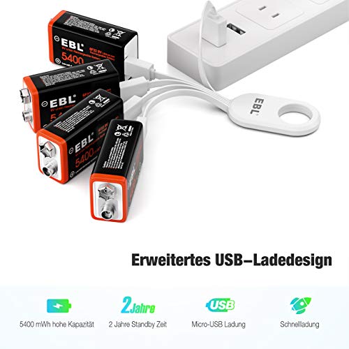 EBL 9V oplaadbare batterijen, 1,5 V, 5400 mWh, micro-oplaadkabel, snel opladen in 2 uur, verpakking van 4 stuks