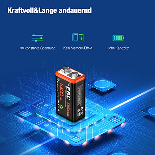 Specification: EBL 9V oplaadbare batterijen, 1,5 V, 5400 mWh, micro-oplaadkabel, snel opladen in 2 uur, verpakking van 4 stuks