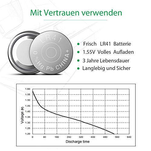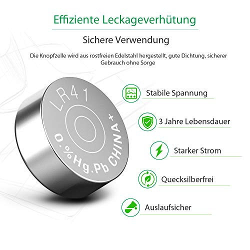 【Professioneel & betrouwbaar】LiCB sinds 2006 richten wij ons op batterijen voor 13 jaar. De LR41-knoopcel is getest volgens strenge kwaliteitscontrolenormen. CE- en RoHS-gecertificeerd. Deze LR41/AG3 1,5 volt alkalinebatterijen van klasse A zorgen voor een langere levensduur van de batterij en levensduur.
