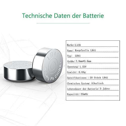 Specification: LiCB 20 stuks LR41 knoopcelbatterijen, AG3 SR41W 392 1,5V alkaline batterij 3 jaar houdbaarheid 100% volledige garantie