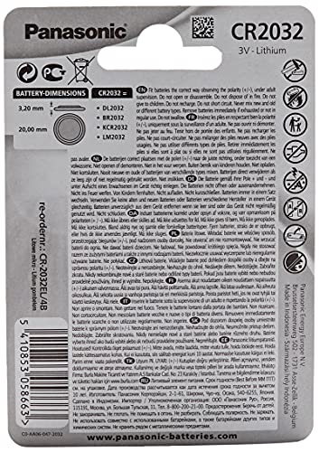 De Panasonic CR2032 lithium knoopcel met 3 V heeft een diameter van 20 mm en 3,2 mm hoogte en biedt langdurige energie.